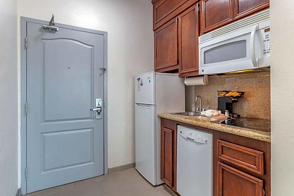 This king room features a cable TV and kitchenette with a microwave, refrigerator and dishwasher.
